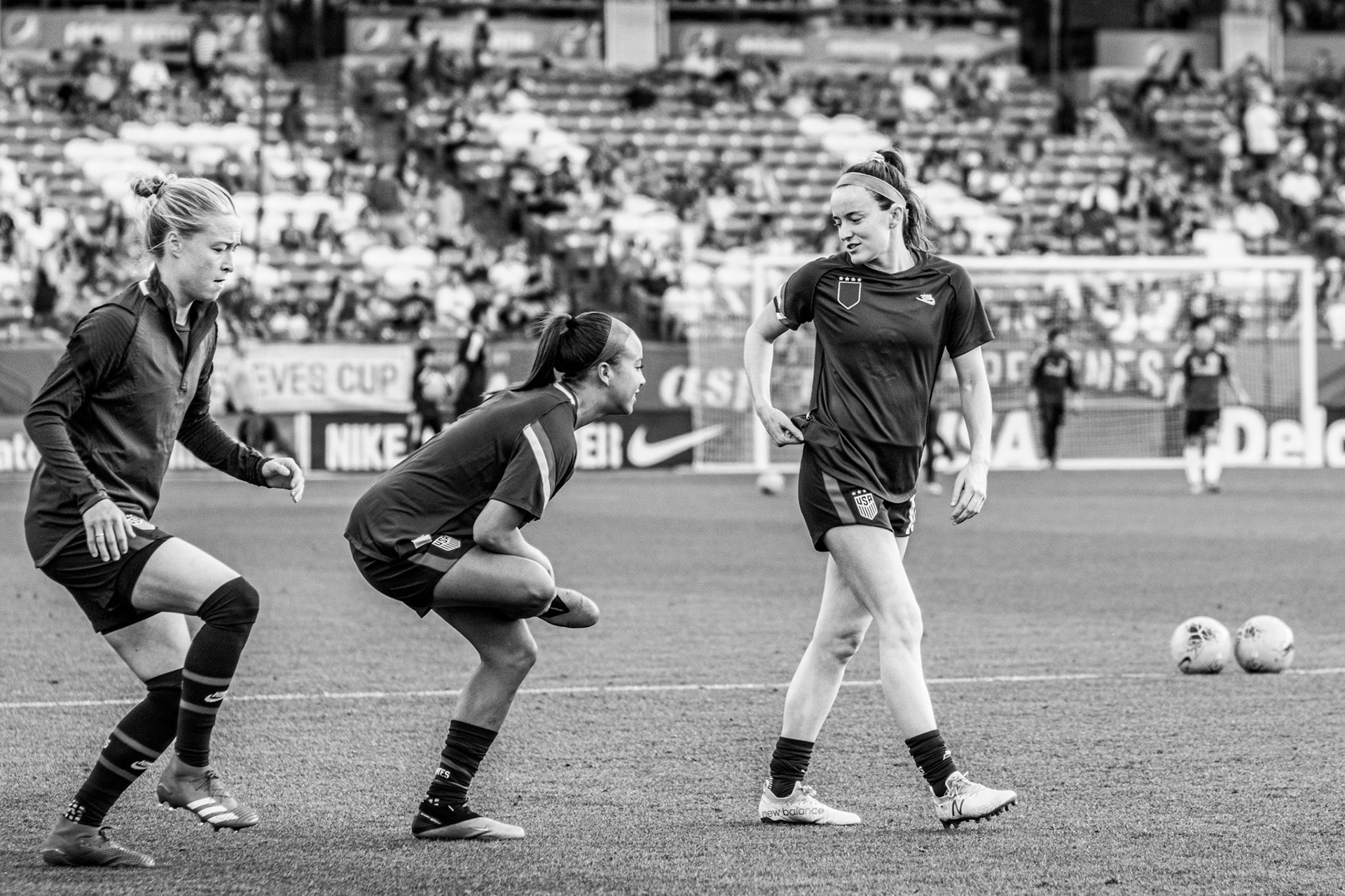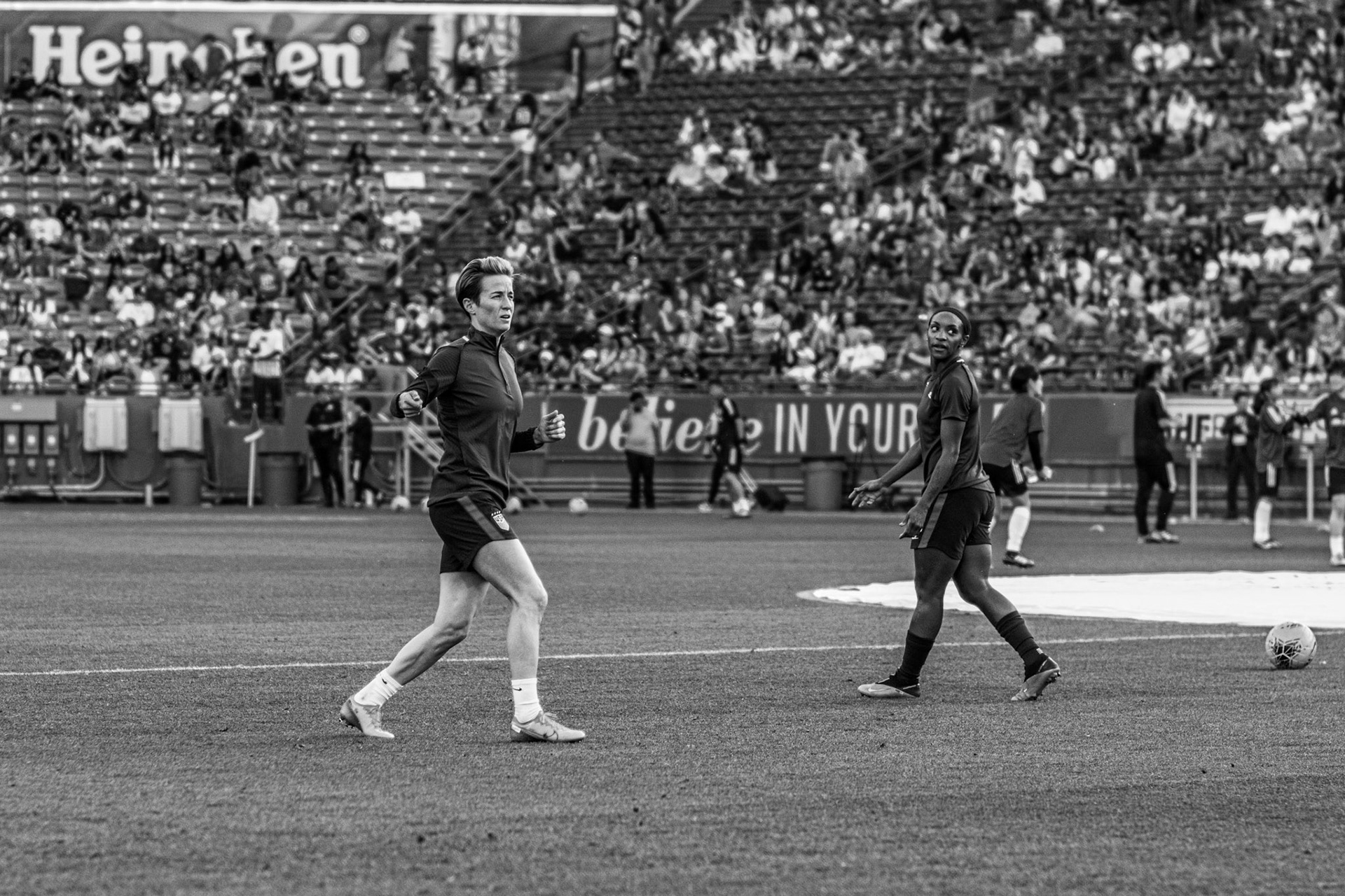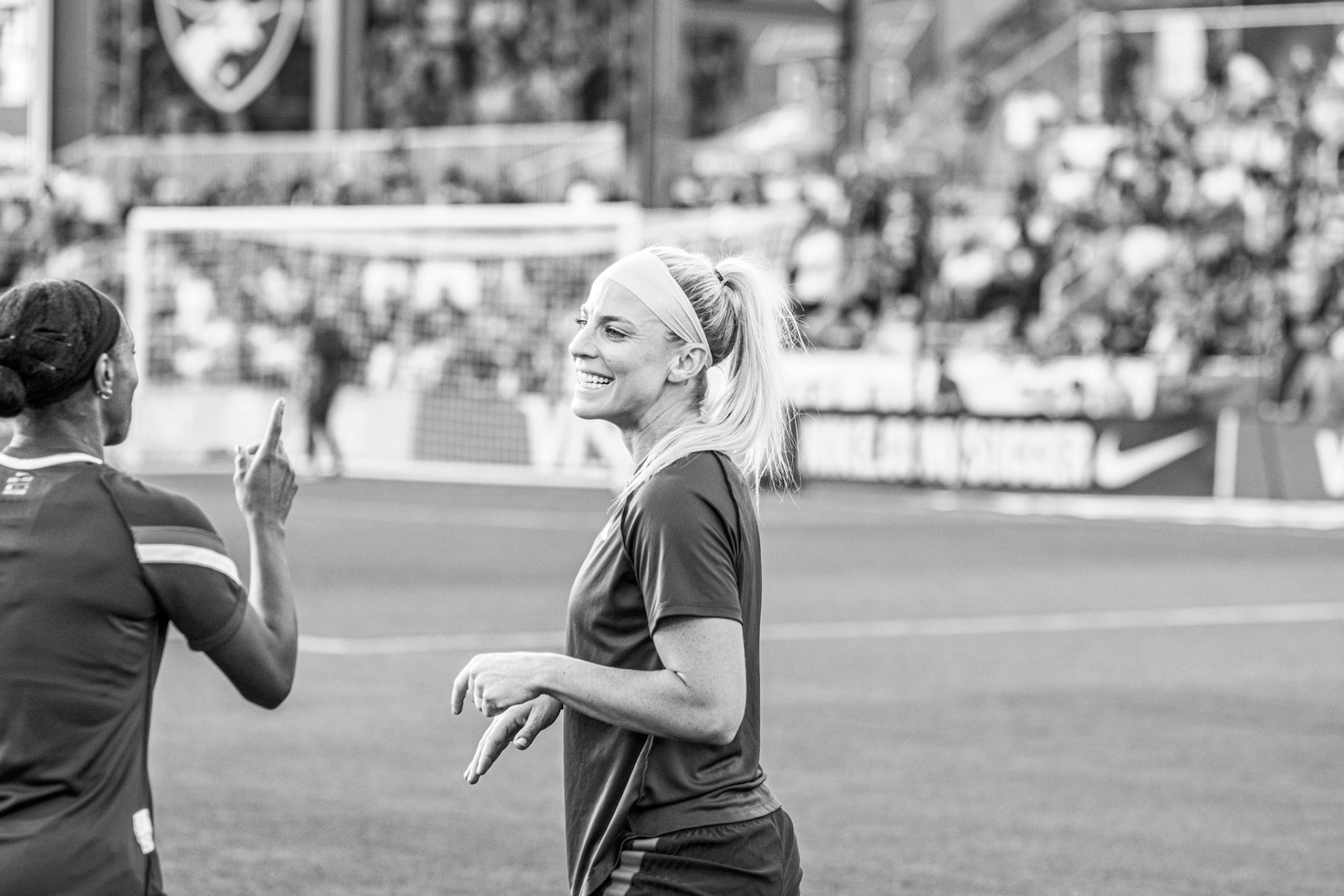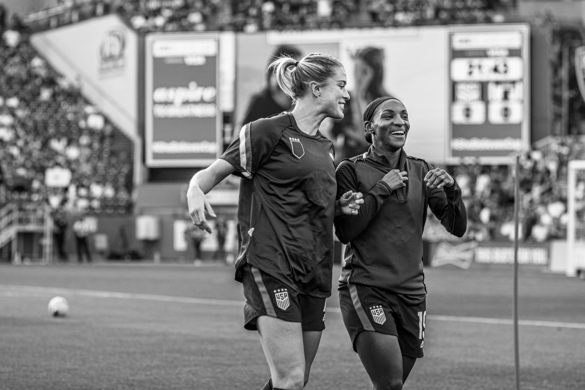 Ali Krieger and Julie Ertz share a laugh during warmups.