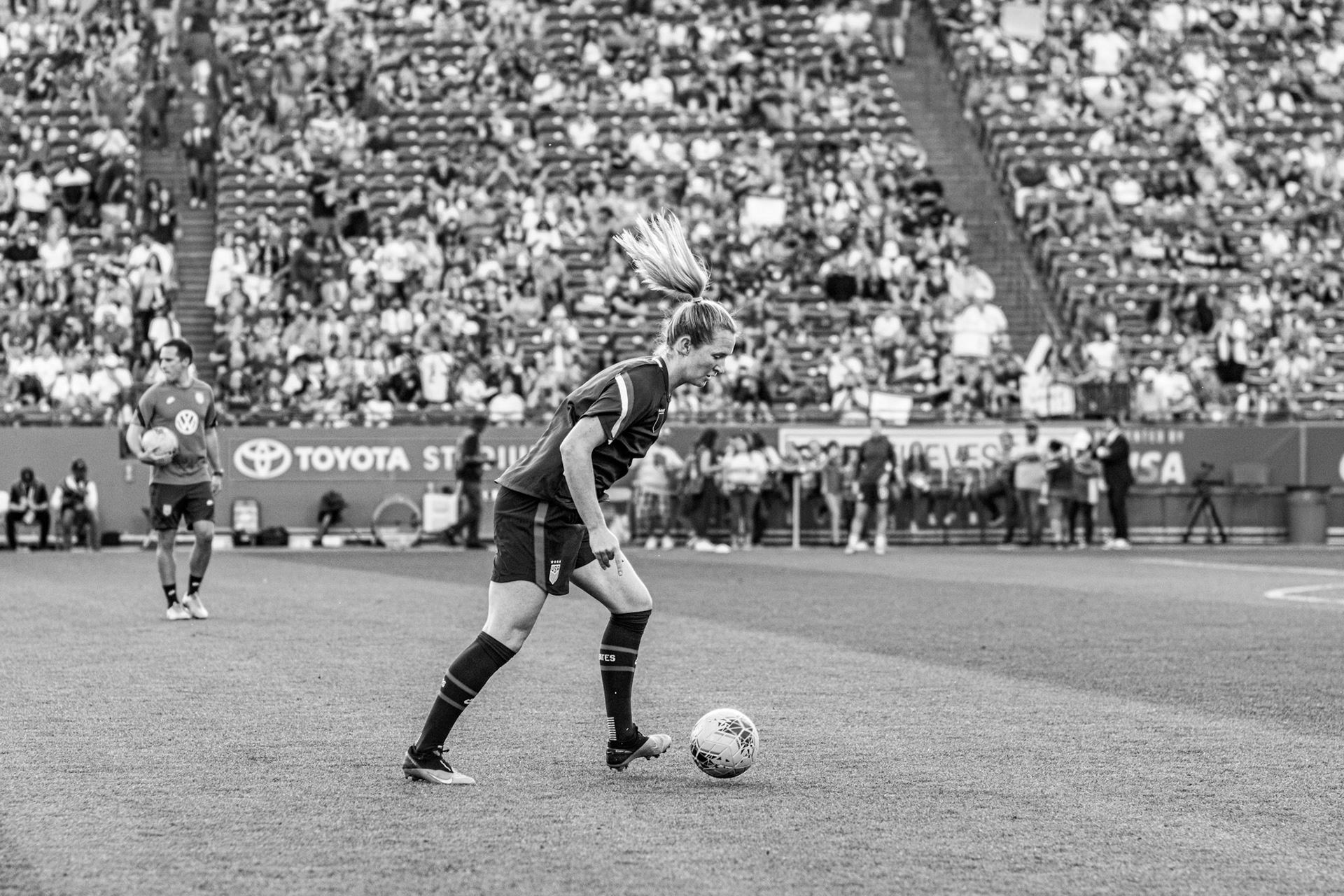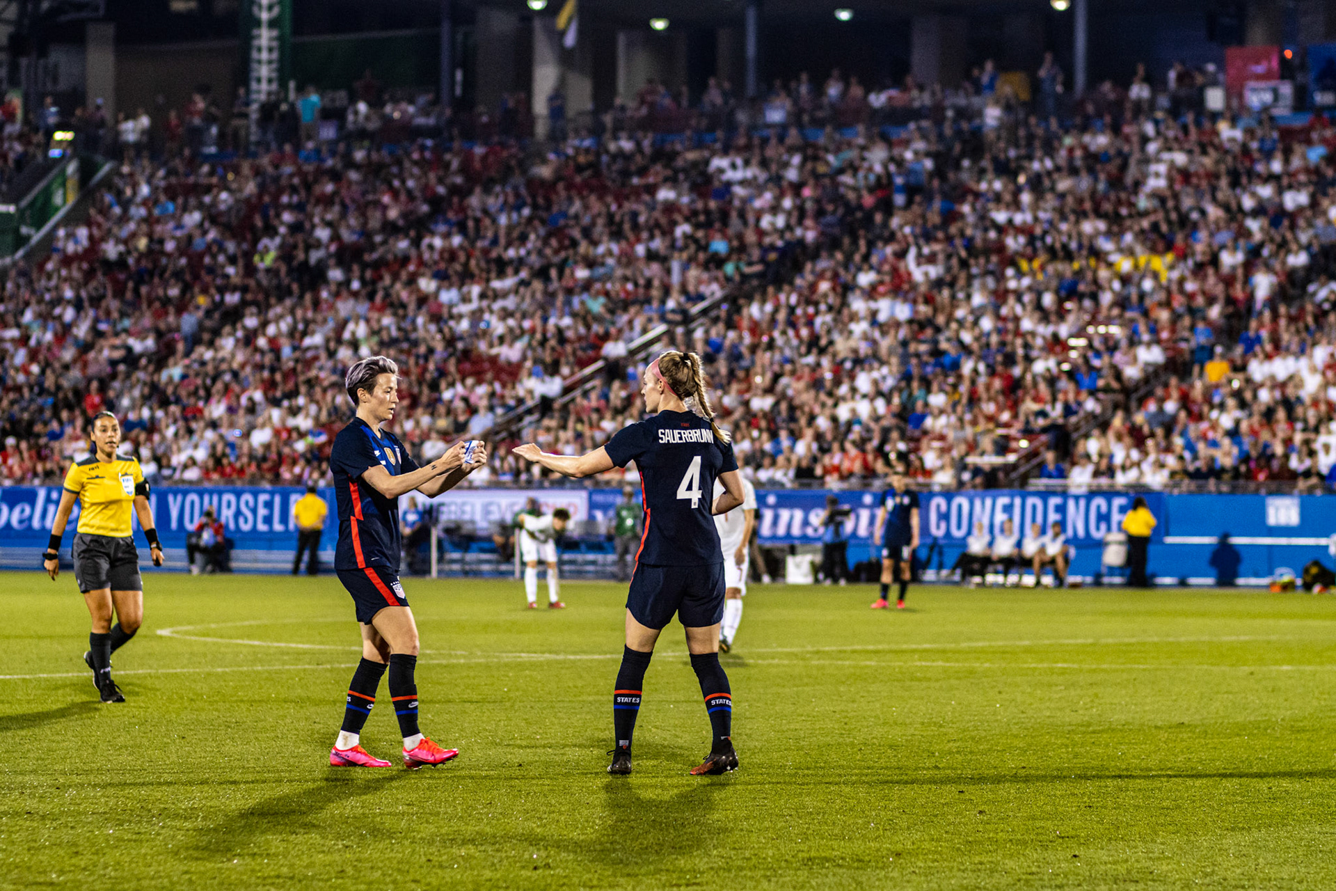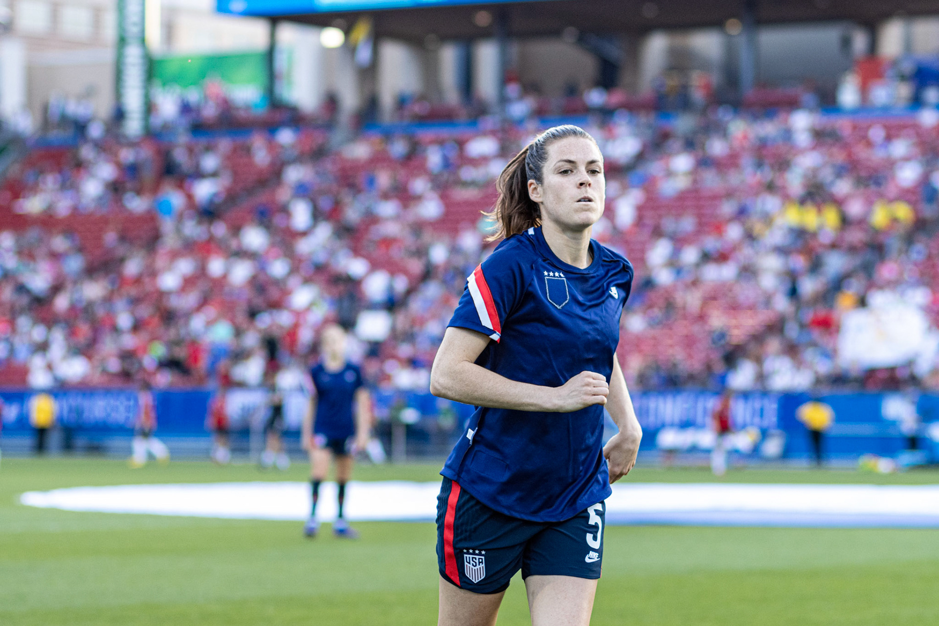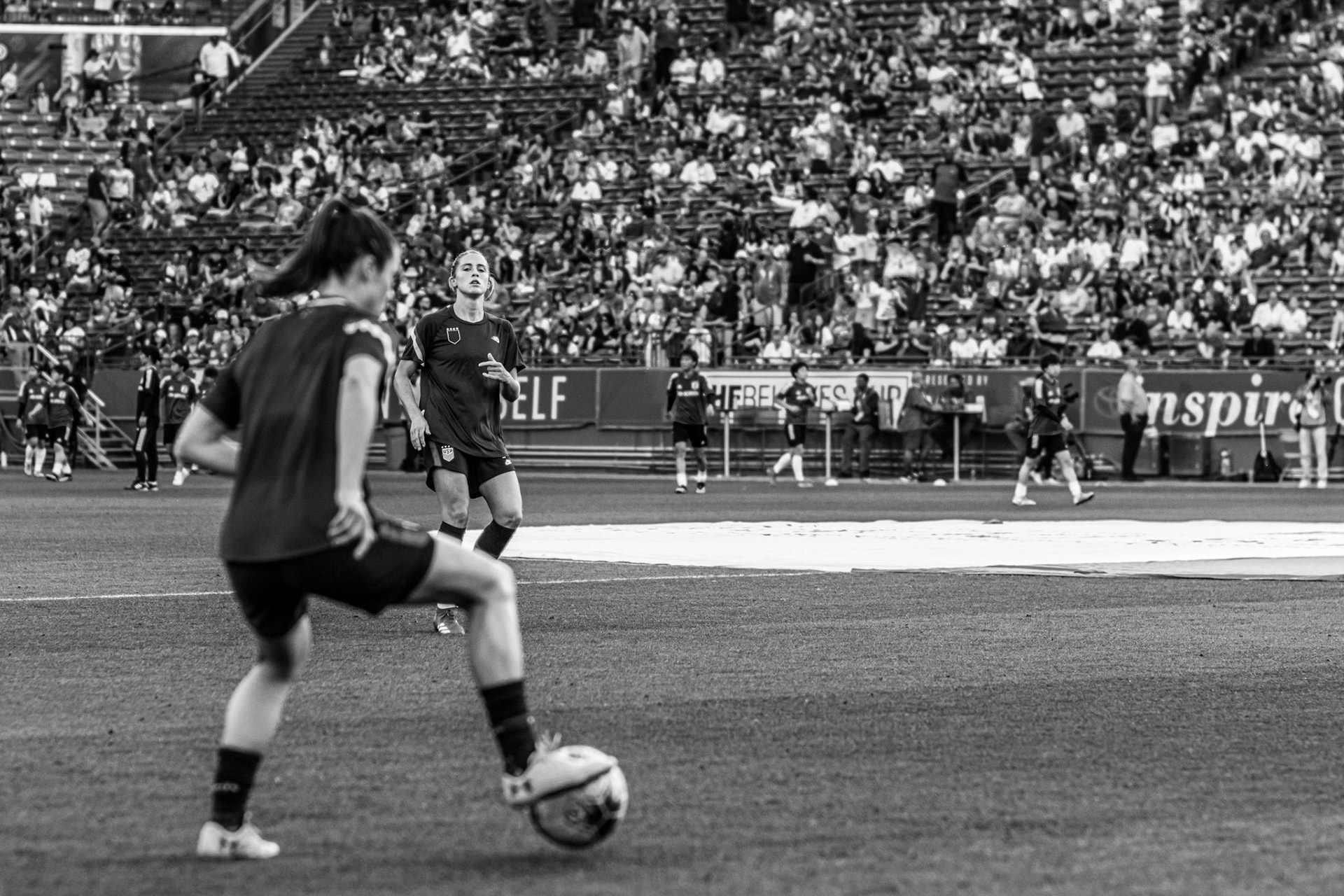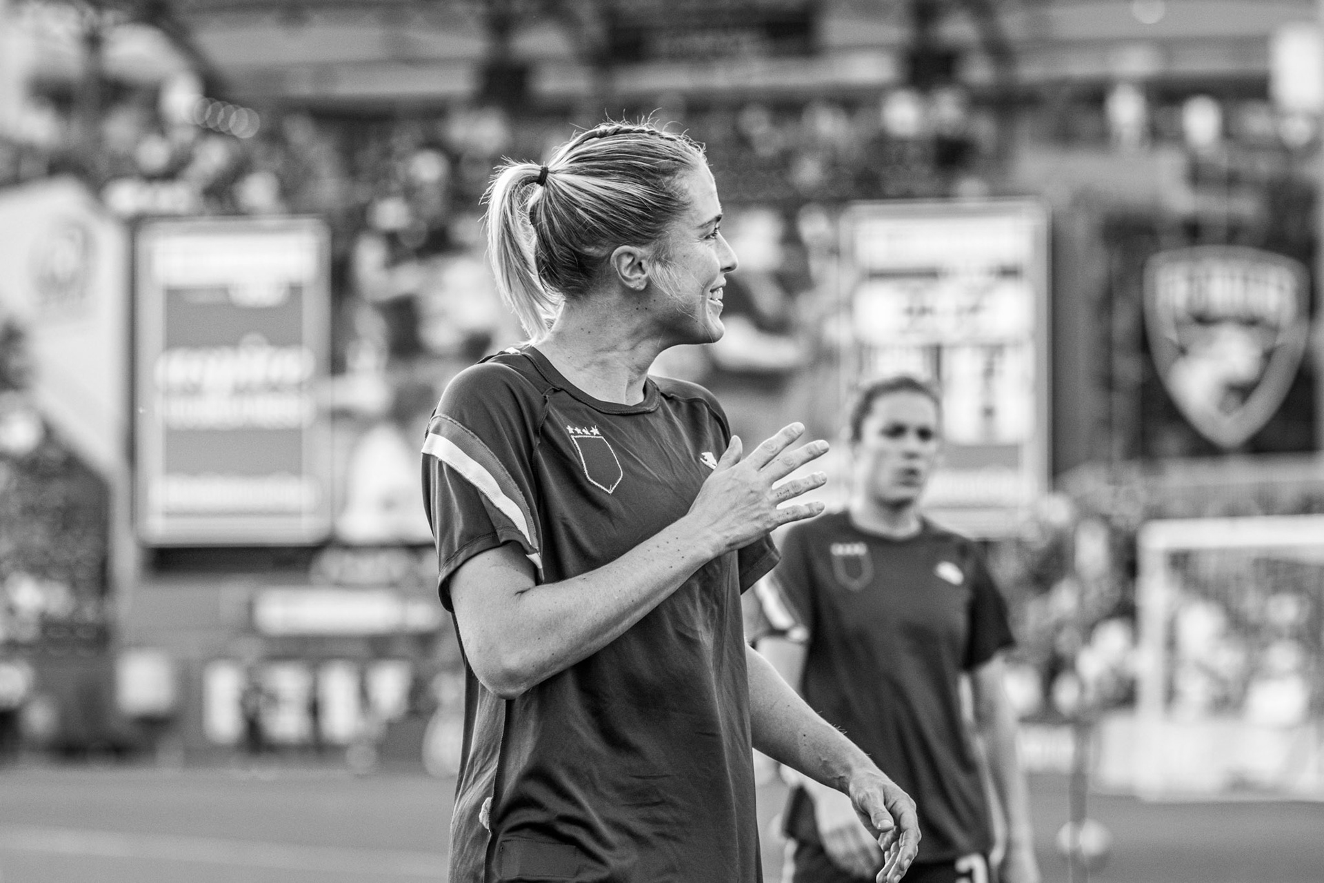 Ali Krieger and Julie Ertz share a laugh during warmups.