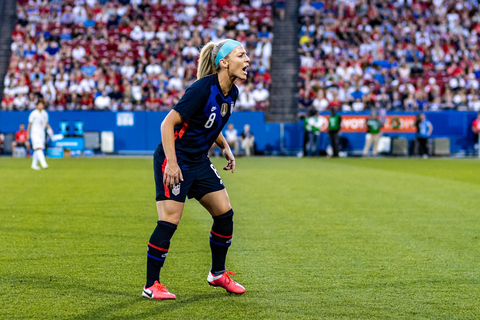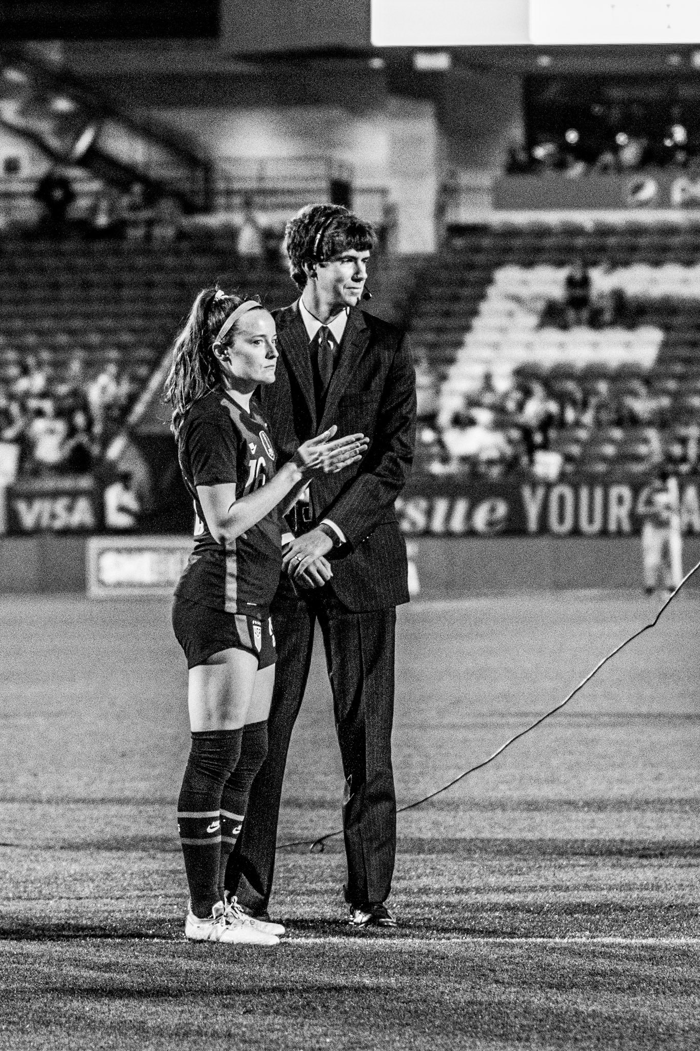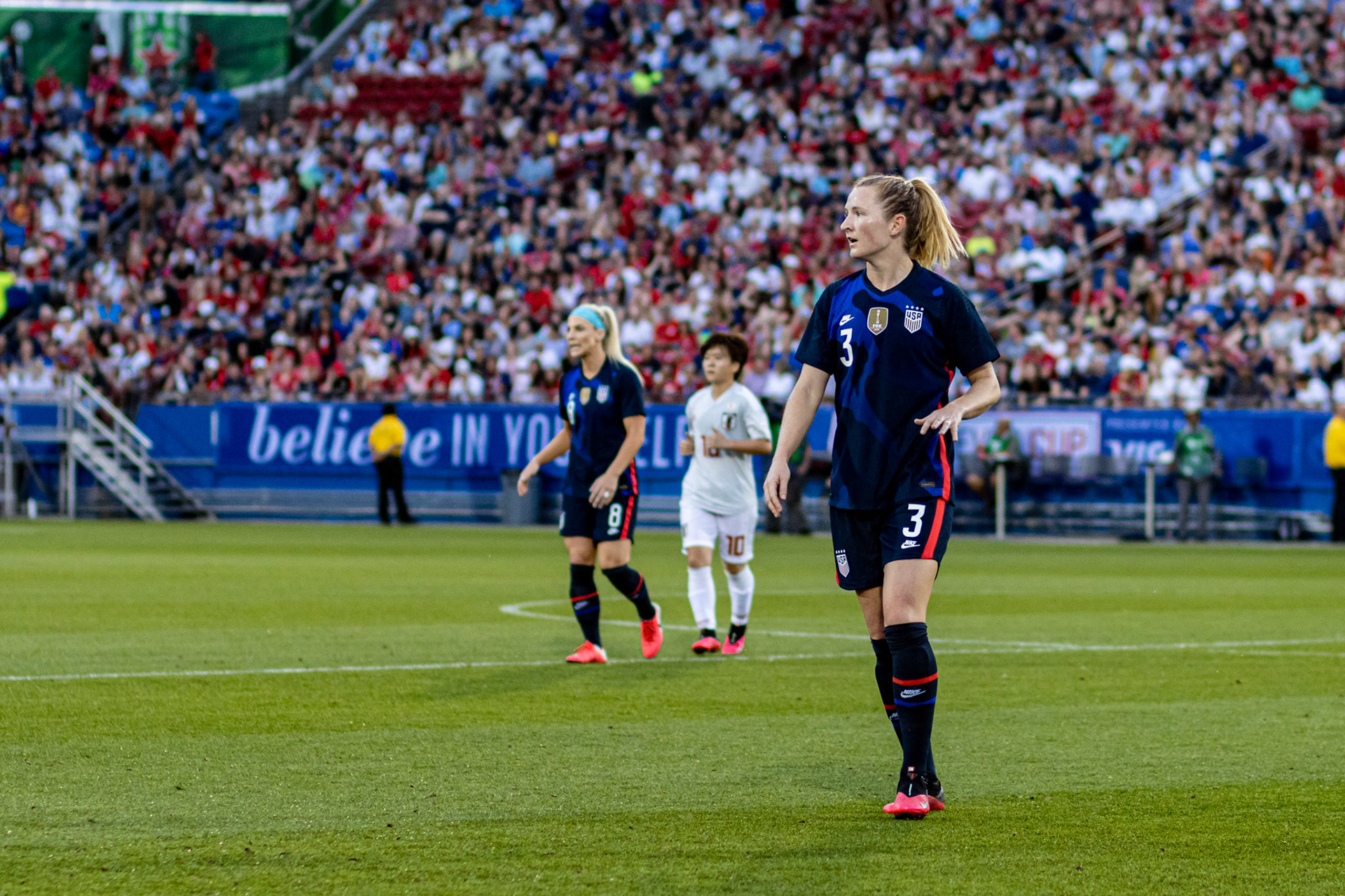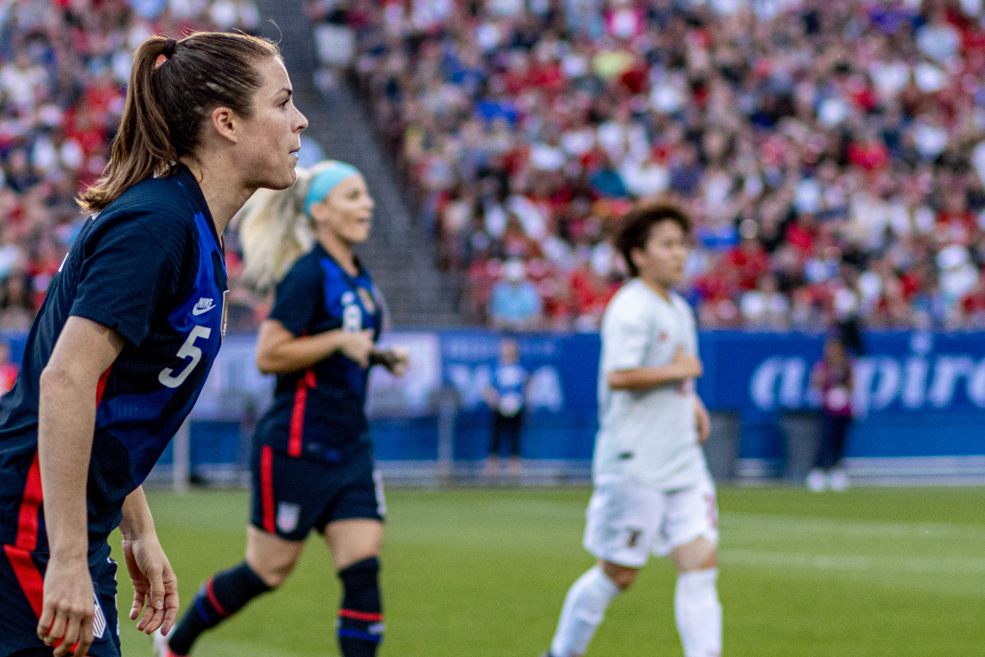 Ali Krieger and Julie Ertz share a laugh during warmups.