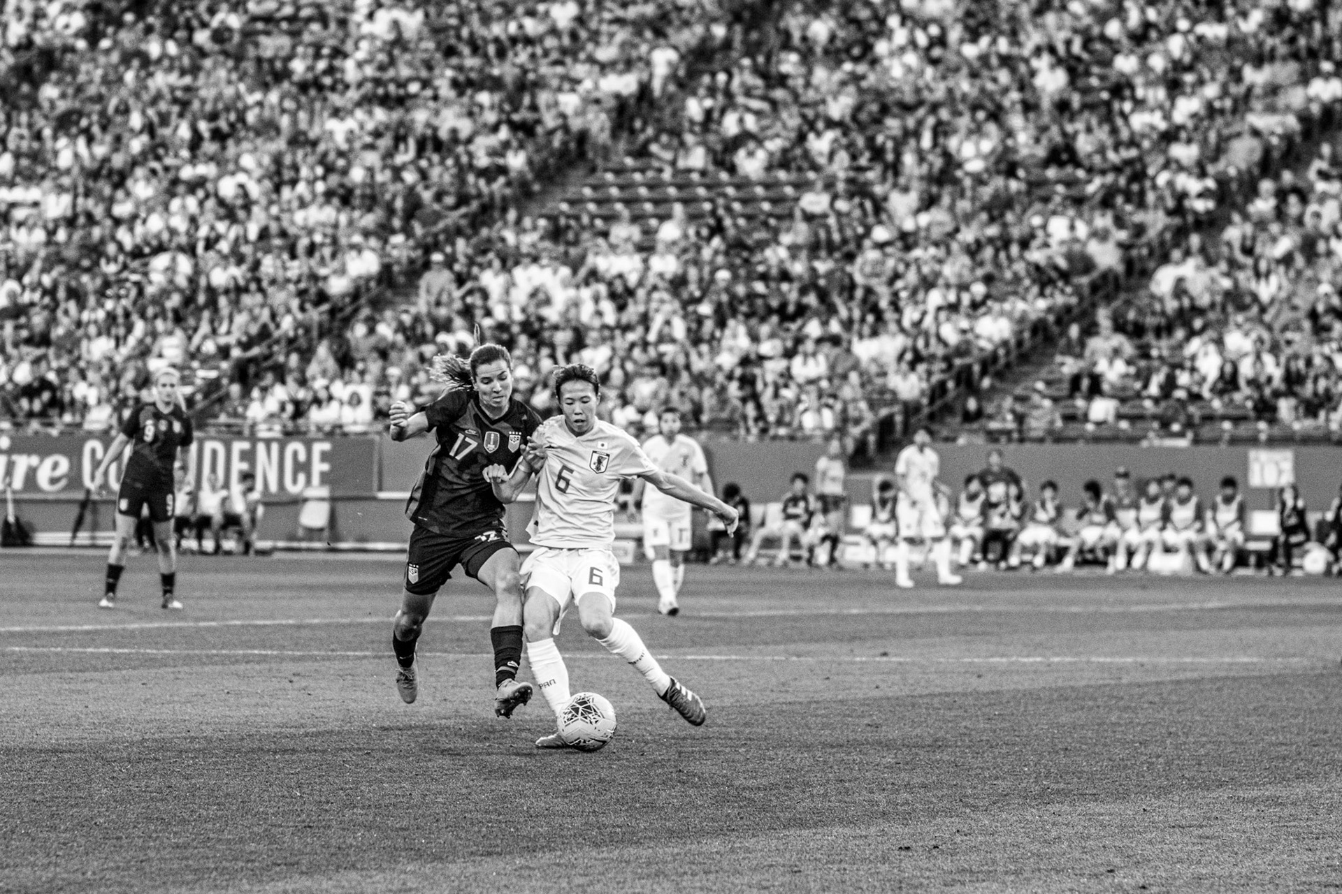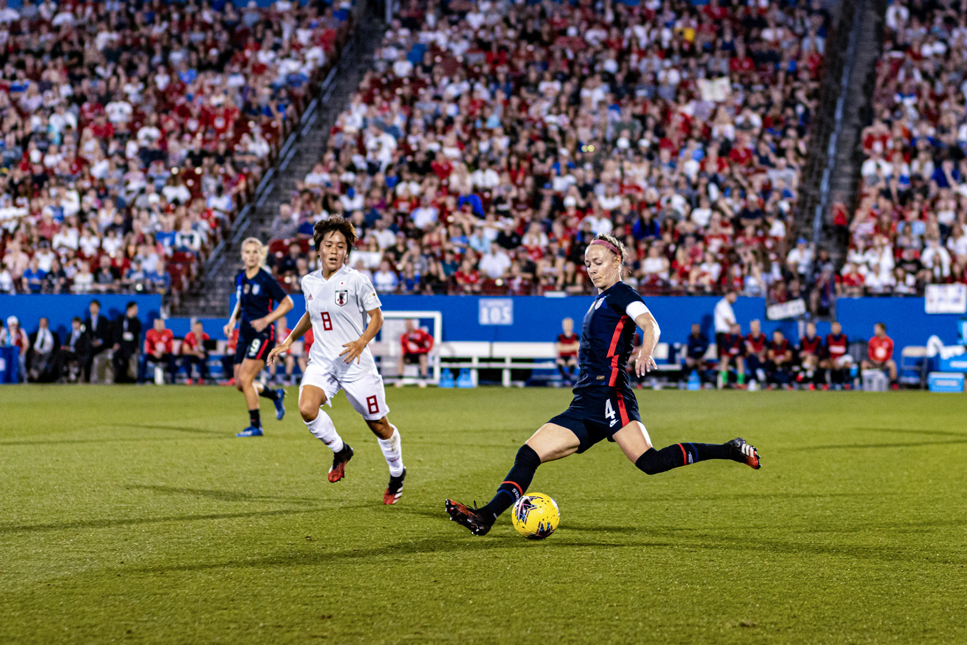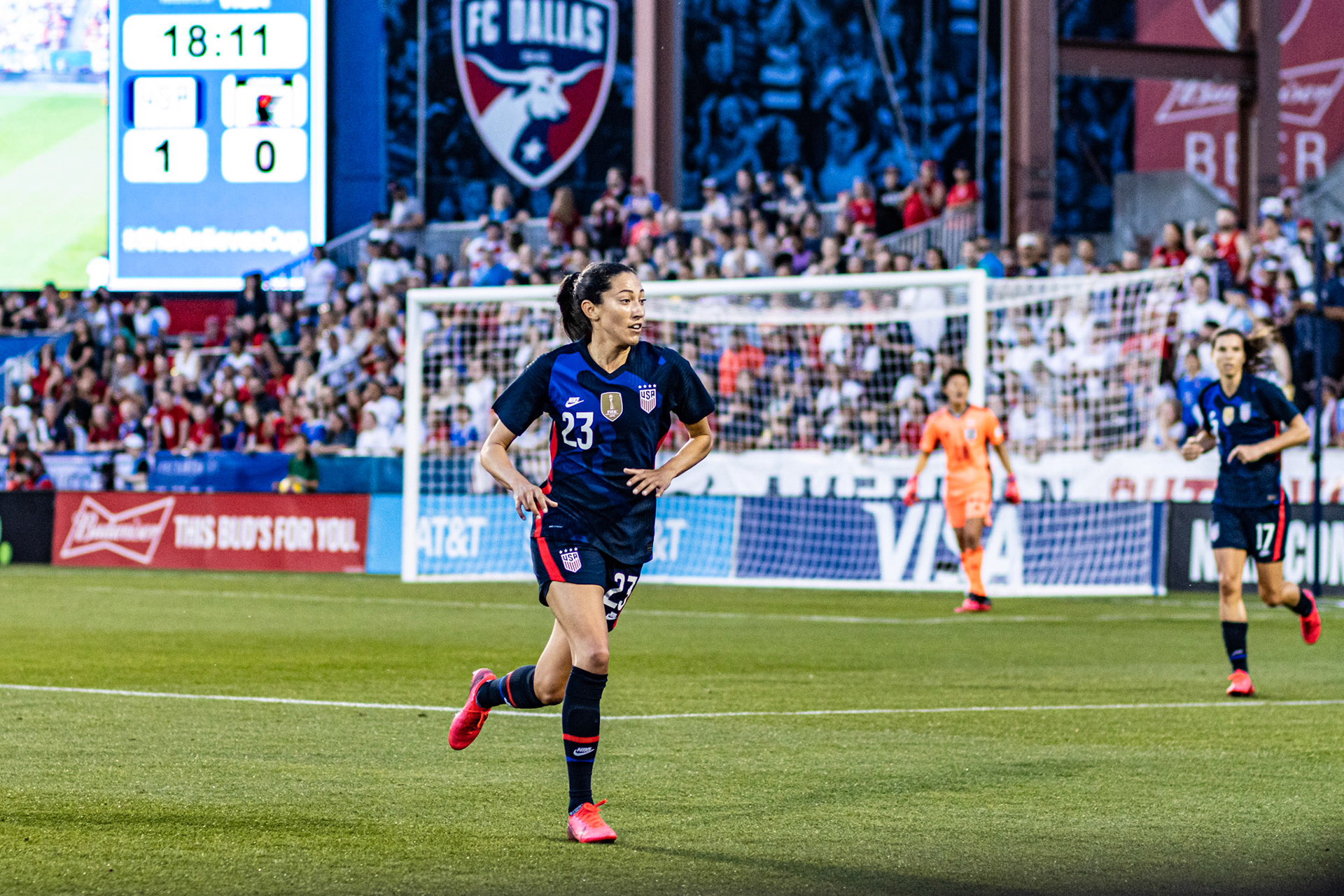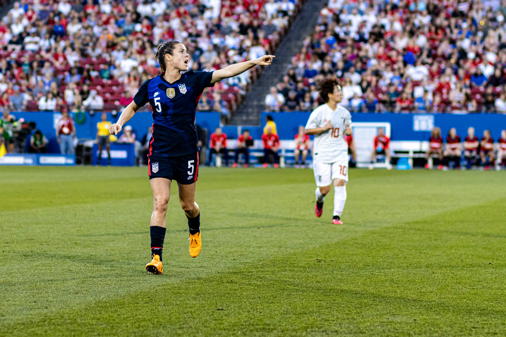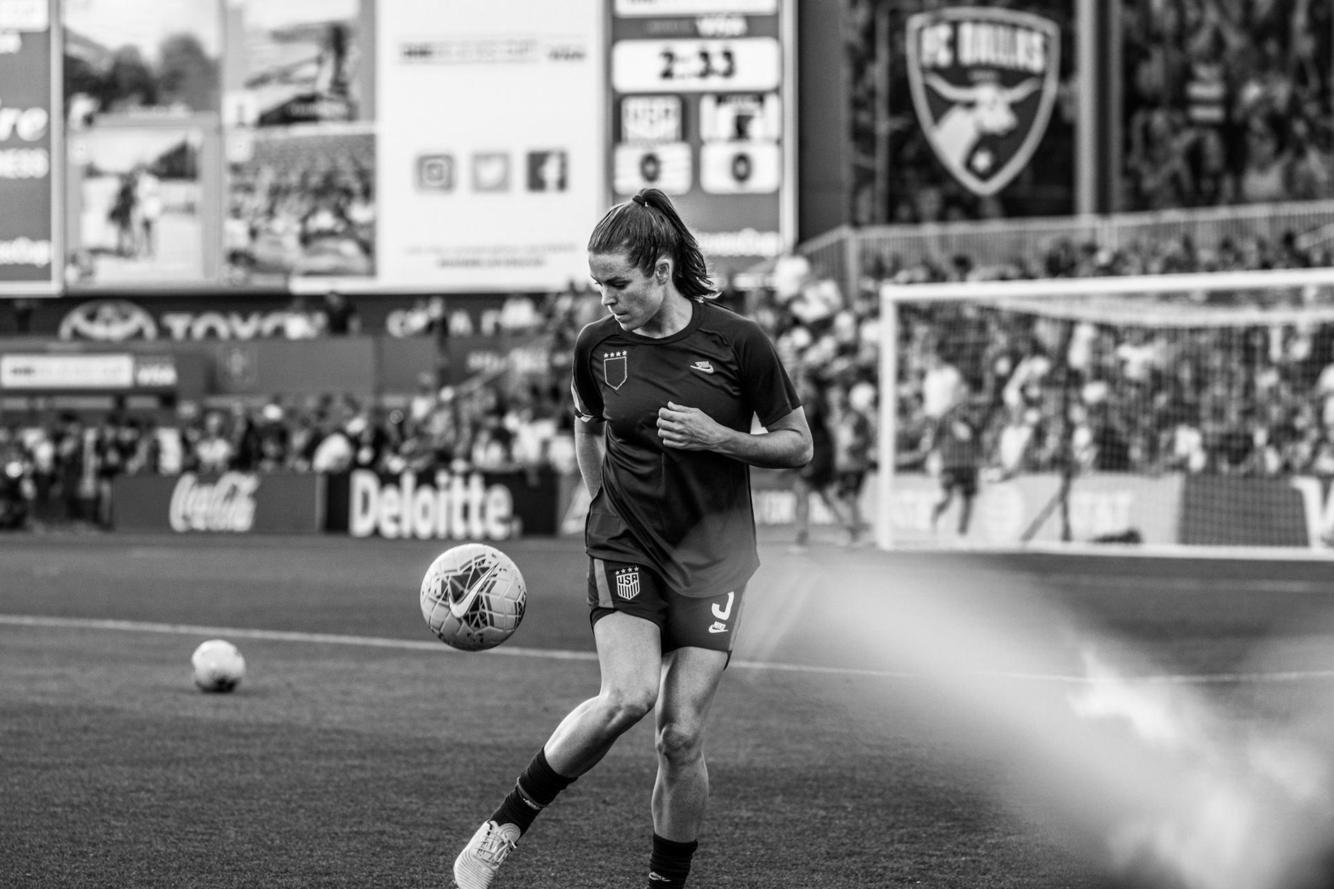 Ali Krieger and Julie Ertz share a laugh during warmups.